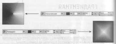 Градиент (отлат. gradiens — шагающий) — мера возрастания или убывания в пространстве какой-либо физической величины на единицу длины. Градиентная заливка — заливка с переходом между цветовыми тонами. В CorelDRAW такой переход (по направлению, форме, числу ступеней) весьма разнообразен и может регулироваться в больших пределах. Градиентная заливка позволяет художнику с удивительной простотой и большой эффективностью осуществлять тоновой прием. Допустим, мы можем мгновенно окрасить квадрат в 256 оттенков черной краски, что заняло бы у традиционного художника не один час напряженного труда. Что важно — эта про-це дура совсем не обременительна для компьютера: занимает ничтожно малый ресурс. В арсенале компьютерного художника Градиентная заливка — наиважней-ш ий инструмент. Поэтому работу его будем изучать обстоятельно. Начнем с Ти тов Градиентной заливки. Их четыре: Линейный, Радиальный, Конический, Кв адратный. Рисуем четыре квадрата. На Панели Свойств инструмента Добавить заливку объекту назначаем каждому квадрату соответствующий тип.